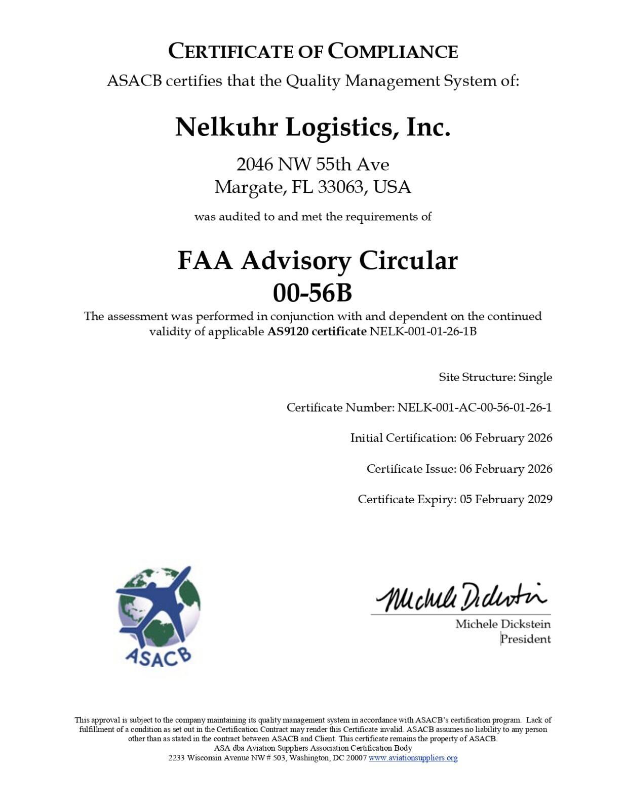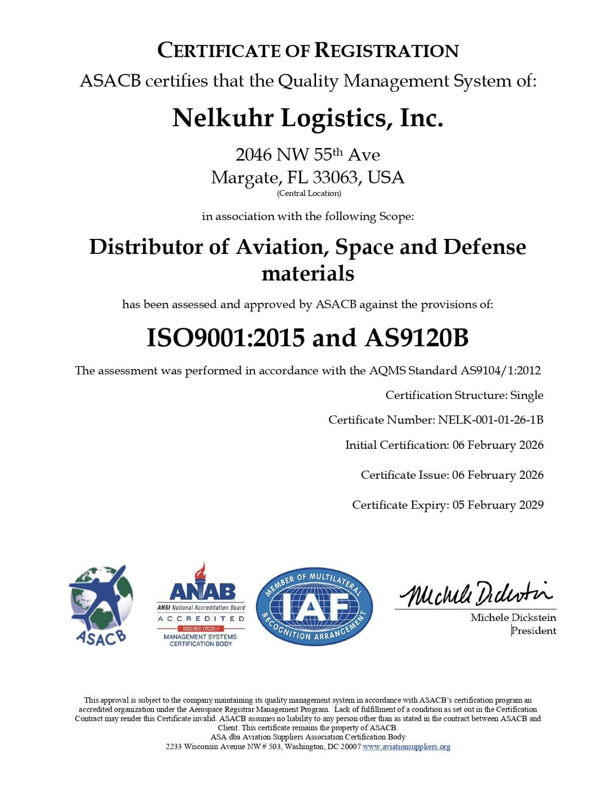We Implemented our practices upon creation of the Nelkuhr Logistics family and brand and have been certified to the ISO 9001:2015 as well as AS9120 Rev. B standard since 2022. We Understand the critical nature of the material we provide to our customers and assure complete compliance and assurance to the quality we all expect in the aviation industry.
